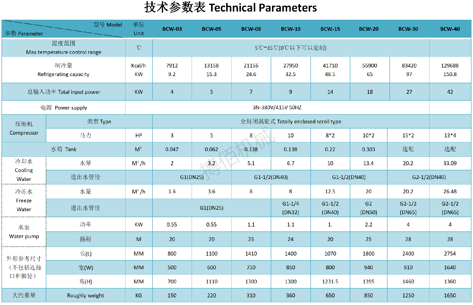 机械、管路部件 可移动式机箱体 适用于室内温+40℃下运行 可以使用清水,水和乙二醇混合液 304不习惯水箱有效避免腐蚀和漏水 高性能品质的不锈钢泵浦可以保障长时间不间断工作 壳管式冷凝系统设计提高换热效率 &nb